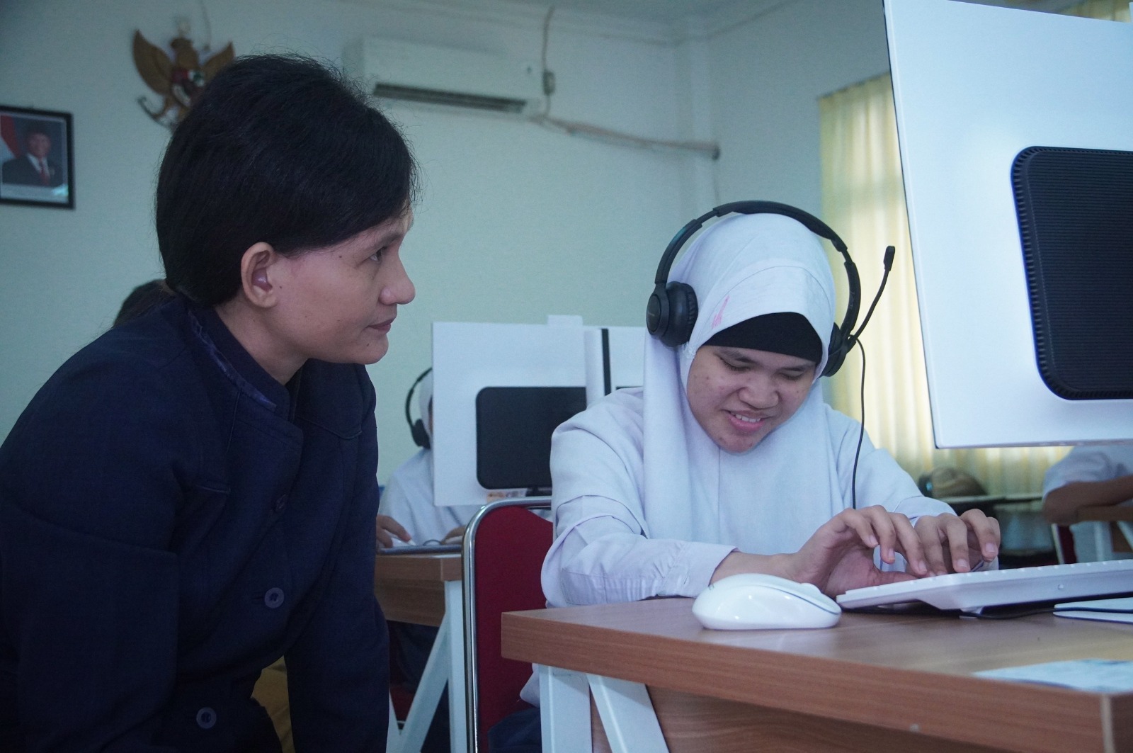 Masih menurut Raka, selain di dampingi guru, ia dan murid tunanetra lainnya juga dibantu dengan perangkat headset untuk mendengarkan soalnya yang dialih bahasakan dengan screen reader. “Selain untuk mendengarkan, headset ini juga membuat kami lebih fokus karena ruangan jadi tidak terasa berisik,” terang Raka.