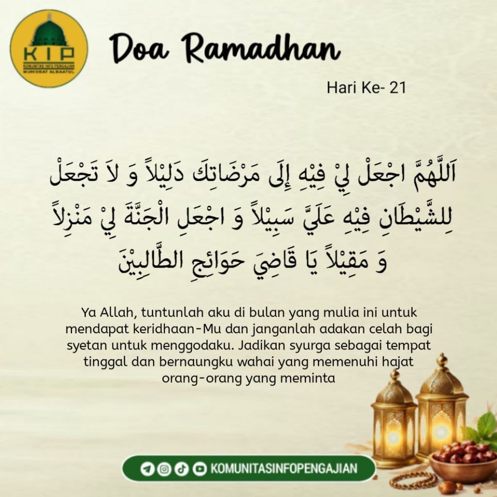 Salah satu doa yang dianjurkan dibaca pada Ramadan hari ke-21 adalah doa untuk memohon petunjuk menuju keridhaan Allah serta perlindungan dari godaan setan.