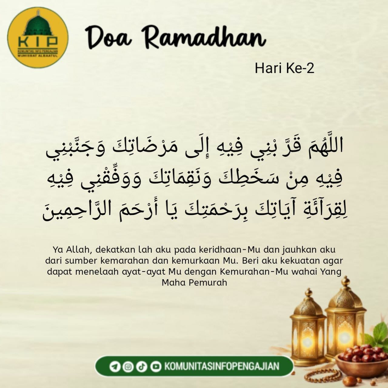 Dengan mengamalkan doa Ramadhan hari ke-2 ini, diharapkan setiap Muslim semakin istiqamah dalam ibadah, menjaga hati dari perbuatan yang mengundang murka Allah, serta menjadikan Al-Qur’an sebagai pedoman hidup.