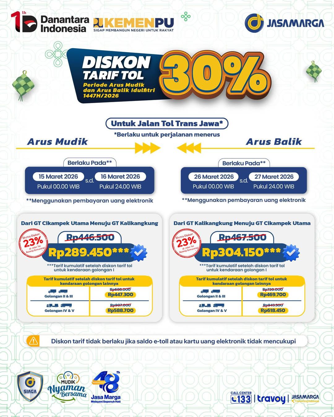 Vice President Corporate Secretary & Legal PT Jasamarga Transjawa Tol, Ria Marlinda Paallo, menyampaikan bahwa program potongan tarif tol ini diberlakukan pada periode arus mudik dan arus balik guna mendorong distribusi lalu lintas yang lebih merata serta mengurangi potensi kepadatan pada puncak arus perjalanan. “Potongan tarif tol sebesar 30% sudah diberlakukan tadi malam tanggal 15 Maret 2026 pukul 00.00 WIB sampai dengan tanggal 16 Maret 2026 pukul 24.00 WIB untuk seluruh golongan kendaraan yang melakukan perjalanan menerus dengan menggunakan uang elektronik serta memastikan saldo mencukupi. Potongan tarif tol ini diberikan kepada pengguna jalan yang melakukan perjalanan dari arah Jakarta melalui Gerbang Tol (GT) Cikampek Utama Ruas Jalan Tol Jakarta–Cikampek menuju Semarang dan keluar di GT Kalikangkung Ruas Jalan Tol Batang–Semarang. Sementara itu, pada periode arus balik, potongan tarif tol akan diberlakukan kembali bagi pengguna jalan yang melakukan perjalanan dari arah Semarang melalui GT Kalikangkung menuju Jakarta dan keluar di GT Cikampek Utama pada tanggal 26 Maret 2026 pukul 00.00 WIB hingga 27 Maret 2026 pukul 24.00 WIB,” jelas Ria.