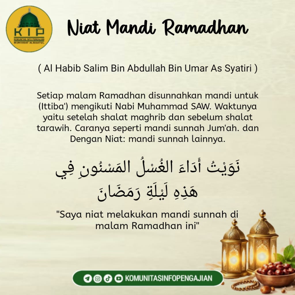 Mandi sunnah ini bukan sekadar membersihkan tubuh, tetapi juga menjadi simbol kesiapan lahir dan batin dalam menjalankan ibadah malam, seperti Tarawih, tadarus Al-Qur’an, hingga qiyamul lail.