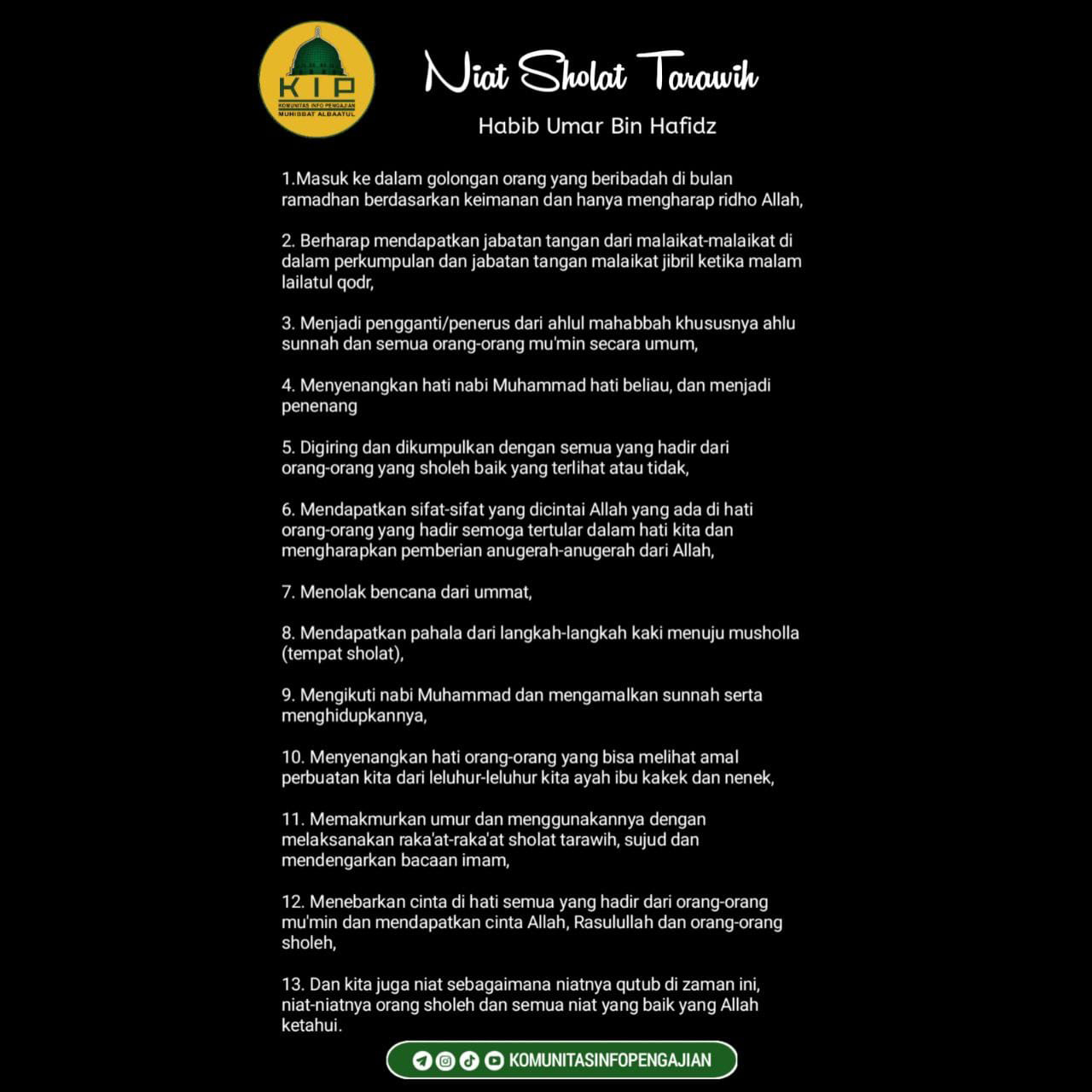 Ulama kharismatik asal Yaman, Habib Umar bin Hafidz, menjelaskan bahwa niat dalam Sholat Tarawih tidak hanya sebatas “ingin sholat”, tetapi bisa diperluas dengan berbagai niat kebaikan yang menghadirkan dimensi spiritual lebih dalam.