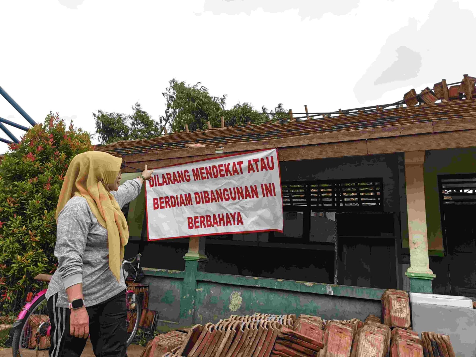 “Kami bekerja sama dengan pemerintah desa untuk antisipasi kejadian lanjutan. Genteng yang masih menjadi beban sudah diturunkan melalui kerja bakti, dan kami pasang spanduk imbauan agar tidak mendekati area bangunan demi keamanan, khususnya bagi anak-anak,” ungkapnya.
