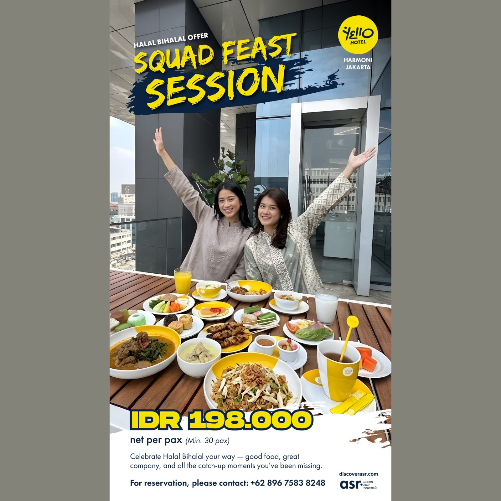 Bagi yang ingin menjalin kembali tali silaturahmi dengan kerabat, sahabat, atau rekan kerja, Yello Hotel Harmoni juga mempersembahkan paket Halal Bihalal “Squad Feast Session”. Tersedia mulai tanggal 20 Maret hingga 16 April 2026, pesta makan ini menawarkan prasmanan makanan khas yang lezat dengan suasana yang santai dan penuh semangat. Paket ini dibanderol dengan harga IDR 198.000 net per orang dengan minimal pemesanan 30 orang, menjadikannya pilihan ideal untuk acara reuni atau pertemuan kelompok yang seru dan penuh tawa.